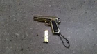 This is a limited edition gold engraved 1:3 mini 1911 metal keychain gun model. It features a detachable keyring and is made of metal. The keychain is designed in the theme of toys and is part of the guns/keychains character family. It was manufactured in China.