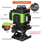 = The laser level meter can emit visible lase horizontal, vertical and tilt lines for the automatic leveling separately or simultaneously. Provides accurate horizontal and vertical datum for indoor construction stakeout and calibration, easy to operate, and versatile. Suitable for flooring tile layout, paneling, wallpapering, stenciling, wainscoting, finish carpentry, wall stud layout and partition installation. You can have a try. Features: Compact size, lightweight and portable, providing quick and convenient mobility and storage with the carrying box. Output 16 laser lines separately or simultaneously for finer positioning, with 3° self-leveling system, flexibility and stability. Using fine quality laser diodes and high p-recision conical mirrors, the lase lines emitted is fine and bright with high accuracy, and the brightness is adjustable. Equipped with self-test calibration function, ≤3° automatic leveling, but if the angle is over 3°, the laser light will keep blinking and the laser level will make a beep sound to reminding you to reset them on a flat ground. LCD display design, you can see the battery remaining capacity clearly. Push button design, push right to open it, push left to close it. Touching buttons design, horizontal line, vertical line and tilt line with a clearly division. The button is wear resistant, with high sensitive to switch the line mode quickly, and with comfortable hand feeling. Press the "OUTDOOR" button for 3 seconds to enter tilt mode then you can place the laser tool at any-angle to project the tilt lines; Press the "OUTDOOR" button shortly or long time press "H" or "V" button, you can adjust the laser brightness according to the working condition freely. Comes with one remote controller, "V"=vertical line, "H"=horizontal line, and you can adjust the brightness of laser light easily by press the "+"or "-" button. Scanning QR code on the back of remote controller to download cellphone APP, convenient to control the level machine. The laser level is controlled by the APP through BT connection, and also has electric quantity display, laser light brightness adjustable and voice control function. The T-shape bracket with 7mm wall mounted distance, which has 360° rotatable base, and equipped with fine adjustment mechanism, can make the machine quickly find the target (1/4 inch screw size). With 360° rotatable base, with 1/4 inch thread, for easy connected to 1/4 inch thread tripod to adjust the working height of the machine. 1/4 inch to 5/8 inch thread adapter for easy connection, it can be used with 5/8inch thread tripod to adjust the working height of the machine. The laser level lifting bracket, height adjustable, anti-slip texture design for increasing friction, more stable placement. Waterproof and dustproof, suitable for both indoor and outdoor use, continuous laser pulsed laser. Note: The laser output maker is located on the output hole. Do not stare directly at the laser light. Do not disassemble the instrument and perform internal repairs by yourself. This instrument meets the laser radiation safety rating standard. Specifications: Name: Laser Level Main material: plastics+metal Type:green-US Plug Laser class: class 2, output power <1mW Line type: 4 * 360° Wavelength: 532nm (Green) Battery: 2 * rechargeable lithium battery, 3.7V, 2400mAh (included) Horizontal/vertical: ±2mm/10m Automatic leveling-range: ±3° Working temperature: -5℃ to 50℃ Waterproof grade: IP54 Working distance: 25m Level machine: 130 * 102 * 134mm / 5.12 * 4.02 * 5.28in Tripod base size: 96 * 82 * 72mm / 3.78 * 3.23 * 2.83in Wall-mounted bracket size: 161 * 71 * 89mm / 6.34 * 2.80 * 3.50in Iron-board: 100 * 60 * 12mm / 3.94 * 2.36 * 1.47in Lifting platform size: 127 * 90 * 30mm / 5.00 * 3.54 * 1.18in Carrying bag size: 220 * 233 * 150mm / 8.66 * 9.17 * 5.91in Item weight: 1485g / 3.27lb Package size: 220 * 165 * 255mm / 8.66 * 6.50 * 10.04in Package weight: 1649g / 3.64lb Packing List: 1 * Level Machine 2 * Battery 1 * Battery Recharger 1 * Tripod Base 1 * Wall-mounted Bracket 1 * Iron Board 1 * Lifting Platform 1 * Remote Controller 1 * 1/4inch to 5/8inch Thread Adapter 1 * Carrying Bag 1 * Guideline Your satisfaction is our eternal pursuit