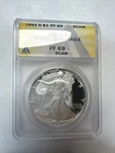 Precious Metal Content per Unit: 1 oz Year: 1991 Certification: ANACS Composition: Silver Certification Number: 5423596 Strike Type: Proof Country/Region of Manufacture: United States Coin: American Eagle Total Precious Metal Content: 1oz Brand: Proof Silver Eagle Brand/Mint: U.S. Mint Grade: PR 69 Fineness: 0.999