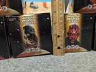 The product is a set of 11 Star Wars Episode I toys that were included in Kids Meals at Taco Bell, KFC, and Pizza Hut in 1999. The toys are associated with the Star Wars character family and were likely part of a promotional campaign tied to the release of the movie. These toys were likely manufactured in China for distribution in the United States, where Taco Bell, KFC, and Pizza Hut are popular fast food chains. The set would be a collectible item for fans of Star Wars memorabilia and fast food promotional items. The set includes 7 toys in 2 x 2 boxes and 4 toys in 4 x 6 boxes. The boxes have never been opened with the exception of the two that I took pictures of. Also included is one kids meal paper bag, Empire strikes Back kids meal box and a plastic to-go bag with Darth Vader's picture on the side.