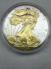 This is a 2015 American Silver Eagle coin, minted by the U.S. Mint. It contains 1 oz of 0.999 fine silver, with a gilded gold obverse design. The coin is uncertified and in uncirculated condition.