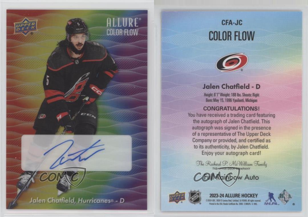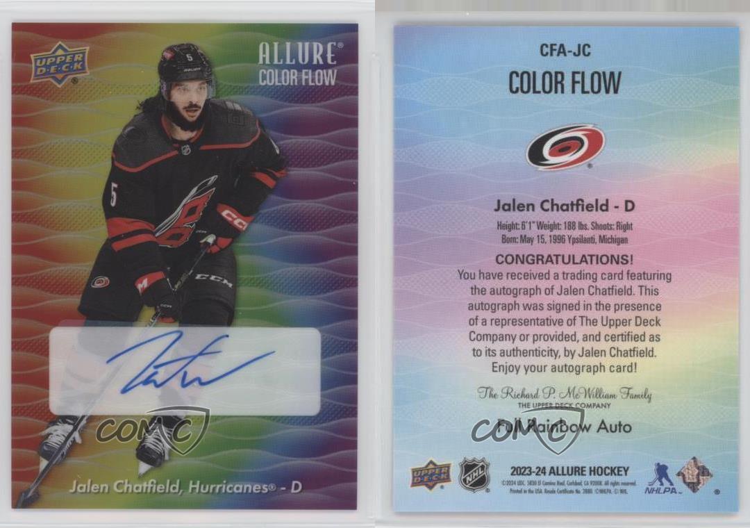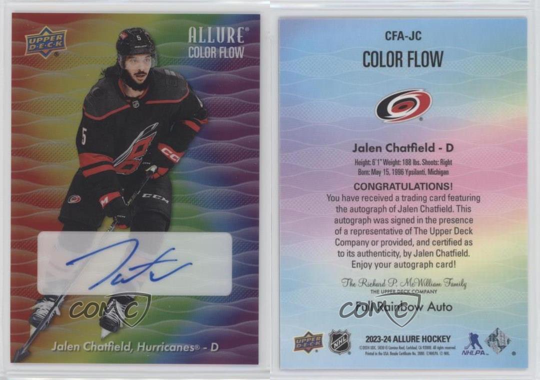2023-24 Upper Deck Allure - Color Flow Full Rainbow Autographs #CFA-JC Jalen Chatfield - Ice Hockey Card - Featuring the Carolina Hurricanes - Featuring Jalen Chatfield Search for more: 2023-24 Upper Deck Allure Search for more: 2023-24 Upper Deck Allure - Color Flow Full Rainbow Autographs View all of our Listings Auctions Buy It Now About Us Located in the beautiful Pacific Northwest, COMC (Check Out My Cards) is the world's largest consignment service for trading card singles. More than 10,000 people have used our consignment service to list over 50 million trading cards. Find out how we can help you consign your items on eBay by contacting us through eBay messaging. COMC -- "The Safe & Easy Way to Buy & Sell" Representative Image - Select Specific Item above to see image of actual item Representative Image - Select Specific Item above to see image of actual item Raw Condition for Modern Cards Unless otherwise noted, raw modern cards are listed in Near Mint-Mint condition or better. A NM-MT card appears to be Mint at first glance, but upon closer inspection, may exhibit some of the following: minor print defects (e.g. roller marks, print line, dimple), minor scratches, slight edge wear, and slight corner wear. Centering is clearly visible in the images provided and does not factor into our condition assessment. Raw Condition for Vintage Cards Unless otherwise noted, raw vintage cards are listed in Excellent condition or better. An EX card may exhibit some of the following: minor rounding of corners, surface wear, print defects, light scratches, and slight edge wear/chipping. Centering is clearly visible in the images provided and does not factor into our condition assessment. Domestic Shipping Combined shipping for multiple items is available. To receive combined shipping, please ensure all desired items are in your eBay shopping cart before proceeding to checkout. eBay limits orders to 40 items per order. We automatically combine multiple orders placed on the same day. If you place multiple orders on the same day, please contact us to request a refund of applicable shipping costs. Signature confirmation may be required on invoices over $400. All cards are protected and shipped securely. International Shipping COMC offers eBay's International Shipping (EIS) for international orders under $2,500* (see country exceptions below). All duties and import fees are paid at checkout; in the rare event that there are additional import fees upon delivery, these are borne by the buyer. EIS packages route through a shipping hub in Erlanger, KY before shipping to their final destination. Please note that EIS does not allow for combined shipments. The shipping rates are determined by eBay and cannot be adjusted. *Maximum sale price exceptions: Colombia, Kuwait ($2,000); Taiwan ($1,539); Chile, Costa Rica, Guatemala, Honduras, Trinidad and Tobago ($1,000); Antigua and Barbuda, Aruba, Belize, Dominica, Grenada, Philippines, Saint Kitts and Nevis, Saint Lucia, Montserrat, Turks and Caicos Islands ($500); Dominican Republic, El Salvador ($200). Please request a shipping quote through eBay messaging for orders that exceed the maximum sale price supported by eBay's International Shipping. You will be responsible for all duties and import fees for international orders shipped outside the EIS. All cards are protected and shipped securely. Payment COMC does not accept offers on our cards through our eBay storefront. COMC utilizes eBay’s managed payments system. If you are experiencing difficulties making a payment, please contact eBay for assistance. Return Policy Returns are only accepted on the rare occasion the item is not as described. If you are making a return, please initiate the return process through eBay so a mailing label can be provided for you. Prior to listing, our expert team carefully assessed this item to represent it accurately. Please review the description and high-definition images prior to purchasing to ensure this item meets your satisfaction. We welcome you to contact us if you have further questions about this item. Trust and Integrity COMC carefully assesses each item consigned to us to prevent fraudulent items from entering the marketplace. If you believe an item offered on COMC may be fraudulent, please contact us with details so we can investigate the issue. Items we determine are outside our supported items policy may be removed. Last Modified: 6/17/2025 1:40:50 PM PDT