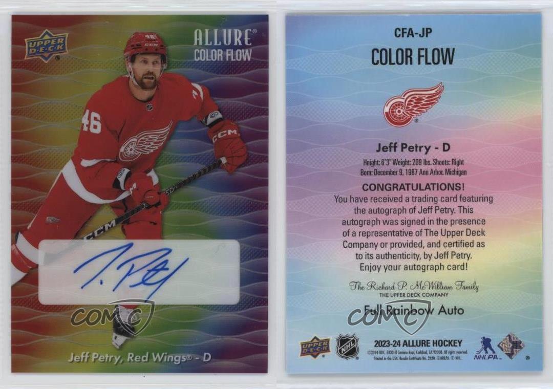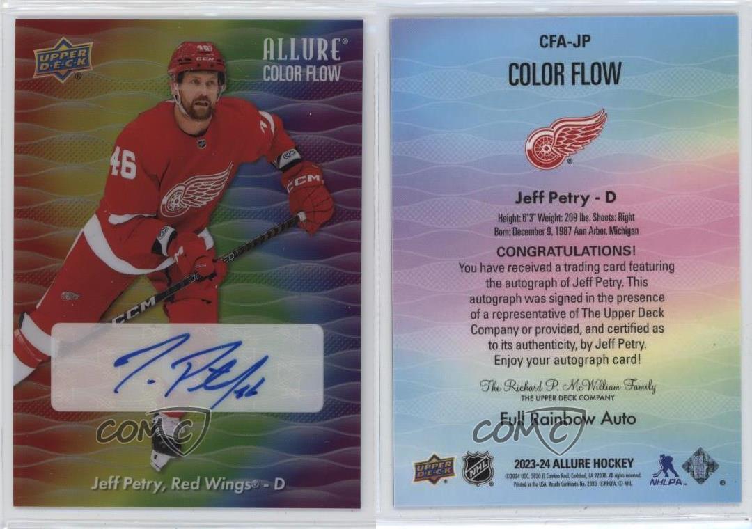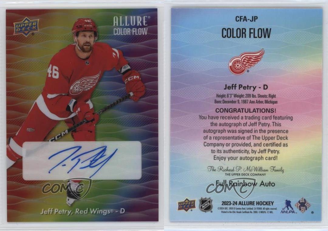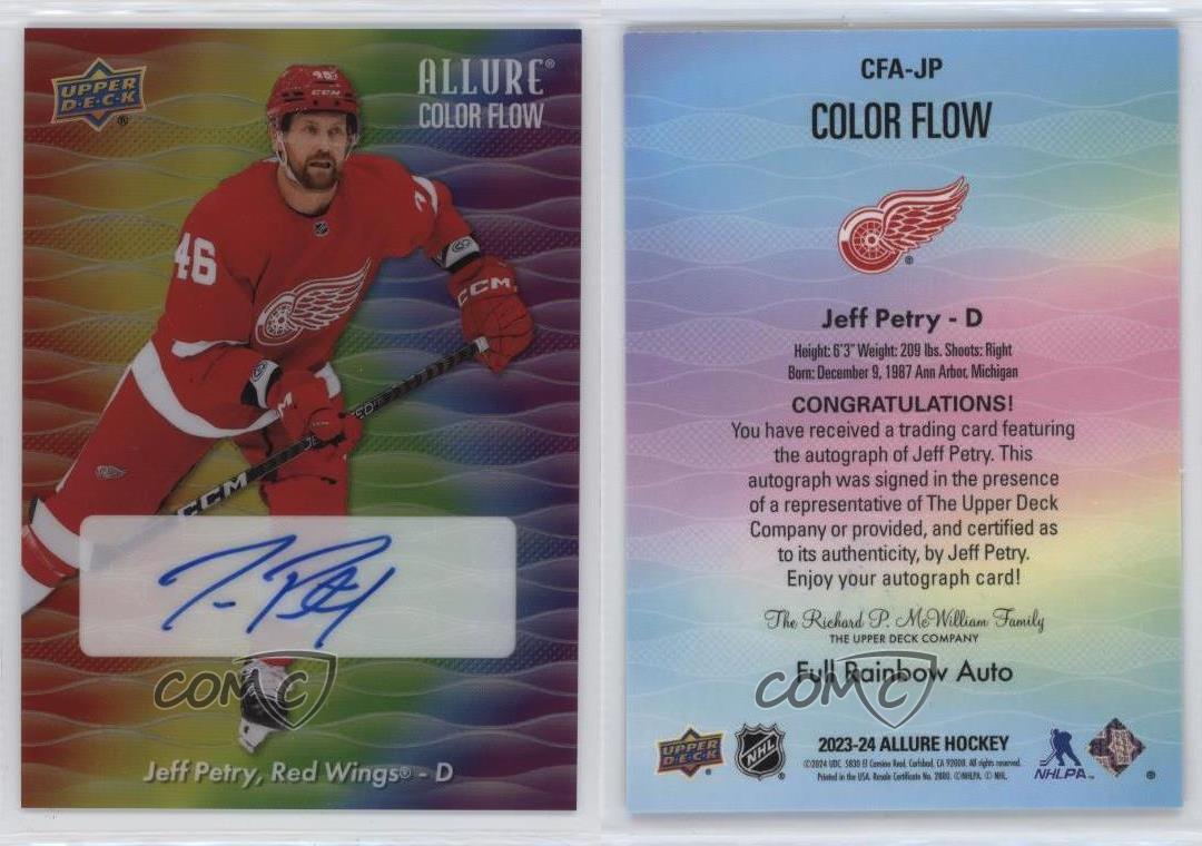 2023-24 Upper Deck Allure - Color Flow Full Rainbow Autographs #CFA-JP Jeff Petry - Ice Hockey Card - Featuring the Detroit Red Wings - Featuring Jeff Petry Search for more: 2023-24 Upper Deck Allure Search for more: 2023-24 Upper Deck Allure - Color Flow Full Rainbow Autographs View all of our Listings Auctions Buy It Now About Us Located in the beautiful Pacific Northwest, COMC (Check Out My Cards) is the world's largest consignment service for trading card singles. More than 10,000 people have used our consignment service to list over 50 million trading cards. Find out how we can help you consign your items on eBay by contacting us through eBay messaging. COMC -- "The Safe & Easy Way to Buy & Sell" Representative Image - Select Specific Item above to see image of actual item Representative Image - Select Specific Item above to see image of actual item Raw Condition for Modern Cards Unless otherwise noted, raw modern cards are listed in Near Mint-Mint condition or better. A NM-MT card appears to be Mint at first glance, but upon closer inspection, may exhibit some of the following: minor print defects (e.g. roller marks, print line, dimple), minor scratches, slight edge wear, and slight corner wear. Centering is clearly visible in the images provided and does not factor into our condition assessment. Raw Condition for Vintage Cards Unless otherwise noted, raw vintage cards are listed in Excellent condition or better. An EX card may exhibit some of the following: minor rounding of corners, surface wear, print defects, light scratches, and slight edge wear/chipping. Centering is clearly visible in the images provided and does not factor into our condition assessment. Domestic Shipping Combined shipping for multiple items is available. To receive combined shipping, please ensure all desired items are in your eBay shopping cart before proceeding to checkout. eBay limits orders to 40 items per order. We automatically combine multiple orders placed on the same day. If you place multiple orders on the same day, please contact us to request a refund of applicable shipping costs. Signature confirmation may be required on invoices over $400. All cards are protected and shipped securely. International Shipping COMC offers eBay's International Shipping (EIS) for international orders under $2,500* (see country exceptions below). All duties and import fees are paid at checkout; in the rare event that there are additional import fees upon delivery, these are borne by the buyer. EIS packages route through a shipping hub in Erlanger, KY before shipping to their final destination. Please note that EIS does not allow for combined shipments. The shipping rates are determined by eBay and cannot be adjusted. *Maximum sale price exceptions: Colombia, Kuwait ($2,000); Taiwan ($1,539); Chile, Costa Rica, Guatemala, Honduras, Trinidad and Tobago ($1,000); Antigua and Barbuda, Aruba, Belize, Dominica, Grenada, Philippines, Saint Kitts and Nevis, Saint Lucia, Montserrat, Turks and Caicos Islands ($500); Dominican Republic, El Salvador ($200). Please request a shipping quote through eBay messaging for orders that exceed the maximum sale price supported by eBay's International Shipping. You will be responsible for all duties and import fees for international orders shipped outside the EIS. All cards are protected and shipped securely. Payment COMC does not accept offers on our cards through our eBay storefront. COMC utilizes eBay’s managed payments system. If you are experiencing difficulties making a payment, please contact eBay for assistance. Return Policy Returns are only accepted on the rare occasion the item is not as described. If you are making a return, please initiate the return process through eBay so a mailing label can be provided for you. Prior to listing, our expert team carefully assessed this item to represent it accurately. Please review the description and high-definition images prior to purchasing to ensure this item meets your satisfaction. We welcome you to contact us if you have further questions about this item. Trust and Integrity COMC carefully assesses each item consigned to us to prevent fraudulent items from entering the marketplace. If you believe an item offered on COMC may be fraudulent, please contact us with details so we can investigate the issue. Items we determine are outside our supported items policy may be removed. Last Modified: 7/9/2025 12:06:54 AM PDT