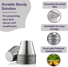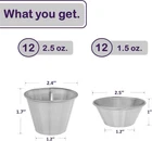 FOOD GRADE MATERIALS - You get 12 cups of 1.5oz, and 12 cups of 2.5oz, a total of 24 reusable cups, made with high-quality food-safe Polished stainless steel, these condiment cups are made with strong constructions gives them a modernistic appeal, all-purpose cups are ideal for hot and cold sauces! EASY TO WASH - a smooth surface with an extra-fine finish that resists leftovers make cleaning easy, seasonings and sauces come right off, Use these small ramekins to serve your delicious treats, appetizers, and samples, or any sauce-dipping or dining occasion! STACKABLE - The dipping bowls are conveniently stackable for easy storage, The dip bowls feature a simplistic yet practical shape giving it a smooth elegant look, a great alternative to wasting disposable products! STURDY & DURABLE MATERIAL - The stainless steel sauce containers resist corrosion and will not rust, crack, bend, or chip with proper care these ramiken set can last for a lifetime! EXTRA FINE FINISH - This dipping sauce dish features a smooth stainless steel construction featuring a smoothly rounded rim at the top with no sharp spots, flaws, or burrs DIMENSIONS - The 2.5oz cups are 1.8inch height, 2.4inch wide; - The 1.5oz cups are 1inch hight 2.5 wide! Product Description