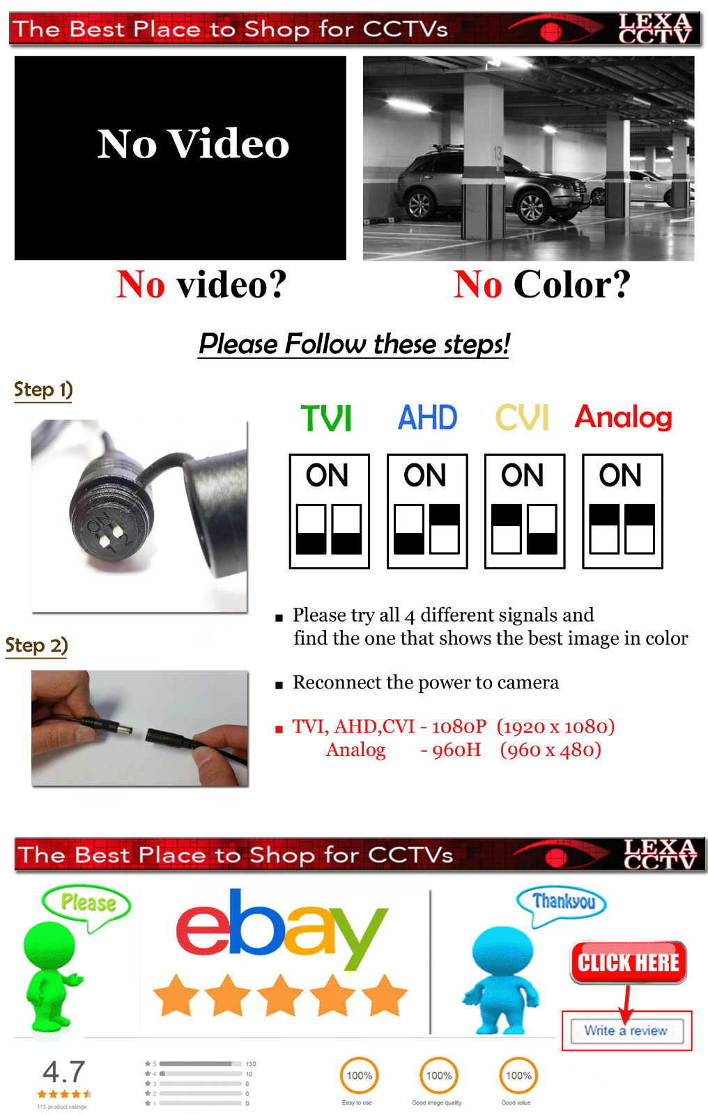 THIS IS NOT WIFI (WIRELESS) CAMERA! This camera ONLY works with the DVR that supports 2MP (1080P) or above! Model LEXA W4424 Image Sensor 1/2.7" 2 Megapixels CMOS Sensor Resolution 1080P - HD Mode - 1920 x 1080 960H - Analog Mode - 960 x 480 Supporting Video Output HD Mode - TVI / CVI / AHD Analog Mode - Analog (CVBS) Lens 2.8mm Wide Angle Lens IR Distance (Night Vision) 60ft (20m) Synchronous System Internal Power/Current DC12V(+/-10%)/ 550mA Weather Proof Yes (IP66 Rated) Vandal Proof Yes (Metal Housing) Minimum Illumination 0.001 Lux/F1.2 Signal System PAL / NTSC S/N Ratio More than 45dB IR Power On Photodiode AUTO Control Dimension 3.7 inch (W) x 2.7inch (H) 94mm(W) x 69mm (H) weight 0.8lb (400grams) Funtion: Automatic Sensor-up function S/N ratio more than 45dbB(AGC off) No ghosting when moving Excellent pixel technology The lowest radom noise Stable black level at high temperature Very stable and long endurance Good quality but with competitive price Shipping and Return Information We usually ship the items within 24 hours after your payment. After the item has been shipped, I will post a tracking number. This item is shipped to only U.S domestic, not international. We are located in NJ. Return Information You can return the item within 30days, shipping charge is not refundable. Also, return can be only accepted with original box. The returned item must be 100% resalable condition which includes all original accessories. You are responsible for shipping cost. You must use UPS or USPS that provide a tracking number. If there is any physical damage found after we get the item back such as scratches, dent..etc, no money will be refunded. Please contact us first before you return, RMA number must be provided before you return the item.