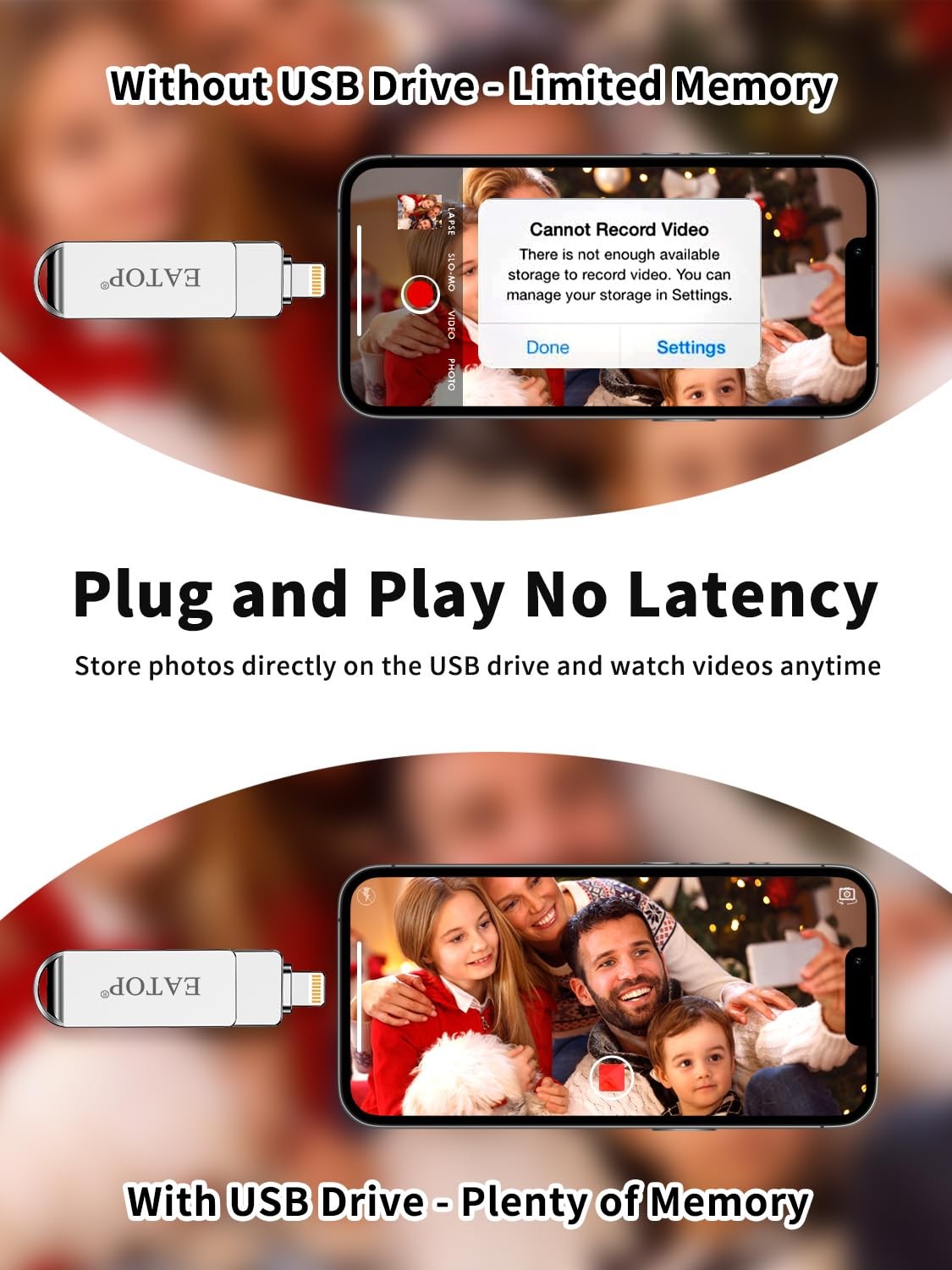 Do you want to make your Phone more convenient? Are you tired of your Phone running out of memory? Do you want to keep enough Phone memory during your trip? Plug and Play, No Application Required! Never lose important documents, videos, photos again thanks to large and reliable Phone flash drives. Free up iPhone and iPad Memory Space Immediately If your iPhone or iPad has almost used up all the memory space, this iPhone USB storage flash drive can help alleviate 512GB of storage space. Whether you like to shoot short videos or take selfies, our iPhone memory stick are perfect for you. Quickly Backup Without Using iTunes or Cloud You can easily backup and manage files at any time. No need of iTunes or Cloud, manage files, pictures and videos through the mobile app to quickly backup to iPhone flash drive, save the storage space of the mobile phone, and at the same time, operations such as forwarding files on the USB drive can be performed. Plug and Play Share your photos, videos, songs and other files between iPhone picture stick easily. You don't have to pay extra for additional storage, just insert iPhone external storage and enjoy the extra space of your flash drive. High Transfer Speed Smart and upgraded chip with high efficiency and stability. read speed up to 30MB/s and write speed up to 15MB/s. The upgraded chip provides you with more efficient storage experience. How to Transfer for iPhone iPad Requires iOS 13 and higher: Simply insert the flash drive into your iPhone iPad, then go to the "Files" app to find "Untitled" and move files to your iPad or iPhone as needed. How to Transfer for Android Android phones need to support OTG, and flash drives can be found in the “File Manager” of most Android devices. 【Plug and Play, No Application Required, Instantly Increases iPhone and iPad Memory Space】If you almost used up all space on your iPhone or iPad, this photo stick for iPhone helps to expand your memory at full storage with 512GB. And usb memory stick for photos is also a great partner for traveling photographers editing on iPad. Using this memory device for your iPhone, iPad or Computers, no worries with the iPhone storage anymore! 【Multi-Port USB Drive】The 3 IN 1 phone photo stick with USB-C Port/ USB-L Port/ USB Port (Independent interface), which is more convenient for data transfer between different devices, so as to get rid of the data cable and iTunes and iCloud, let you switch easily storage space. The Phone thumb drive is designed for use with a wide range of devices, Compatibility iPhone 16/15/14/13/12/11/8/7/6S/SE/XR/XS/XS Max/X Series/iPad Air Series/iPad Pro Series. Also support Android smartphones/Computers and other devices with USB-C Ports. (Tip: For iPhone system version requires iOS 13 or higher, For Android smartphones need to open OTG function) 【Watch Movies, Photos and Play Music Directly From Phone Flash Drive】Store your favorite videos, audios and music on your iPhone's Photo Stick, then seamlessly plug and play on your iPhone or iPad anytime, anywhere. No more need for Internet or WiFi. This iPhone storage device plays videos in many different formats.Pictures stored on the Phone storage device also support different formats. Great way to store all your pictures and videos on an phone external storage device. 【High Transfer Speed】Transfer photos, videos, and files in seconds with our USB stick. With a write speed of up to 15 MB/s and a read speed of up to 30 MB/s, our flash drive for iphone have higher performance than conventional usb storage flash drive. Save time and get more done with iphone photo storage stick. Enjoy the whole relaxing trip with never stuttering or buffering video play on the go. (Tip: No Third-Party Apps Required, Simply insert the flash drive into the iPhone iPad and go to "Files" app) 【How to transfer in iPhone iPad】Requires iOS 13 and higher: Simply insert the flash drive into your iPhone iPad, then go to the "Files" app to find "Untitled" and move files to your iPad or iPhone as needed. 【How to transfer in Android Phones】Android phones need to support OTG, and flash drives can be found in the “File Manager” of most Android devices. 【Kindly Note】1) For Flash Media Devices, 1 megabyte = 1 million bytes; 1 gigabyte = 1 billion bytes. Actual useable capacity may vary. Some of the listed capacity is used for formatting and other functions, and thus is not available for data storage. 2) Up to 30MB/s read speed, write speed is lower. Based on internal testing; performance may be lower depending on the host devices and user’s settings and configurations. 【Kindly Note】The phone case may prevent the proper connection between a phone and a usb flash drive, which could result in the phone being unable to recognize the usb flash drive. In this situation, please do not conclude that the usb flash drive cannot be used, remove the phone case and try again. 【Reliable After-Sales Service】Experience the convenience of high-quality USB memory stick and enjoy our premium customer service at the same time. For the phone flash drive, if you have any questions, we are willing to provide help.
