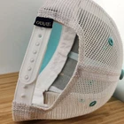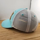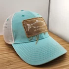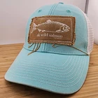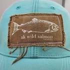 This is an Aqua Alaska AK Wild Salmon Trucker Hat by Ouray, featuring a canvas patch. It is designed for Unisex Adults and is ideal for travel, casual wear, or work. This one-size hat has a mesh back, adjustable snapback closure, and breathable fabric made of polyester and cotton. The hat's style is a classic trucker hat with a theme inspired by Alaska and fishing.