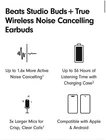 Beats Studio Buds – True Wireless Noise Cancelling Earbuds Clear / OPEN BOX LIKE NEW CNDITION 100% AUTHENTIC BEATS ALL SERIAL NUMBER HAS BEEN RECOREDED IN OUR STORE Included Items BEATS BY DR. DRE - BEATS STUDIO BUDS + TRUE WIRELESS NOISE CANCELLING EARBUDS - TRANSPARENT Beats Studio Buds + deliver rich, premium sound in a pocketable design, wherever you go. Featuring powerful, balanced acoustics, Active Noise Cancelling, Transparency mode, high-quality calls, up to 36 hours of battery life¹, enhanced Apple & Android compatibility, and 4 ear tip options to ensure a custom fit and great sound Beats Studio Buds + Earbuds Pocketable charging case Eartips with four size options USB-C to USB-C charging cable Quick Start Guide Warranty card Features Feel the emotion of powerful, balanced sound from Beatscustom acoustic platform Active Noise Cancelling (ANC) adapts to your personal fit to keep you immersed in the music Transparency mode blends your listening experience with the world around you Up to 36 hours of total battery life (9-hour earbuds + 27-hour charging case)¹ Enhanced Apple and Android compatibility with one-touch pairing and deeper ecosystem integration² Crisp, clear call performance from upgraded, voice-targeting mics Sweat and water resistant earbuds (IPX4-rated)³ Four soft eartip sizes provide a comfortable, stable fit and an acoustic seal for great sound quality Spatial audio for Dolby Atmos surrounds you with sound Extended range and fewer dropouts with Class 1 Bluetooth® Pocket-sized charging case with USB-C connector ¹ Testing conducted by Apple in March 2023 using preproduction Beats Studio Buds + and Charging Case units and software paired with iPhone 13/iPhone 14 units and prerelease software. The playlist consisted of 358 unique audio tracks from the iTunes Store (256-Kbps AAC encoding). Volume was set to 50% and Active Noise Cancellation and Transparency were turned off. Testing consisted of full Beats Studio Buds + battery discharge while playing audio until the first Beats Studio Buds + stopped playback. Battery life depends on device settings, environment, usage, and many other factors. ² Requires an iCloud account and a compatible Apple device running the latest operating system software or a compatible Android device running Android 8.0 or later, with Google Play Services enabled. ³ Beats Studio Buds + are sweat and water resistant for non-water sports and exercise. Beats Studio Buds + were tested under controlled laboratory conditions, and have a rating of IPX4 under IEC standard 60529. Sweat and water resistance are not permanent conditions and resistance might decrease as a result of normal wear. Do not attempt to charge wet Beats Studio Buds +; refer to https://support.apple.com/en-us/HT209542 for cleaning and drying instructions. The charging case is not sweat or water resistant. Compatible hardware and software required. Works with compatible content in supported apps. Not all content available in Dolby Atmos. Specifications True Wireless: true Battery Life Provided by Charging Case: 27 hours Sound Isolating: true Built-In Microphone: true Battery Life: 9 hours Water Resistant: true Wireless Connectivity: Bluetooth Connection Type: Wireless Manufacturer's Warranty - Labor: 1 year Manufacturer's Warranty - Parts: 1 year Rechargeable: true Model Number: MQLK3LL/A Color Category: Clear Headphone Fit: In-Ear Carrying Case: true Charging Accessory Included: Case Works With: Siri Product Name: Beats Studio Buds + True Wireless Noise Cancelling Earbuds Charging Interface(s): USB Type C Ear Tip Sizes Included: Extra small, Small, Medium, Large Brand: Beats by Dr. Dre Color: Transparent Noise Cancelling (Active): true