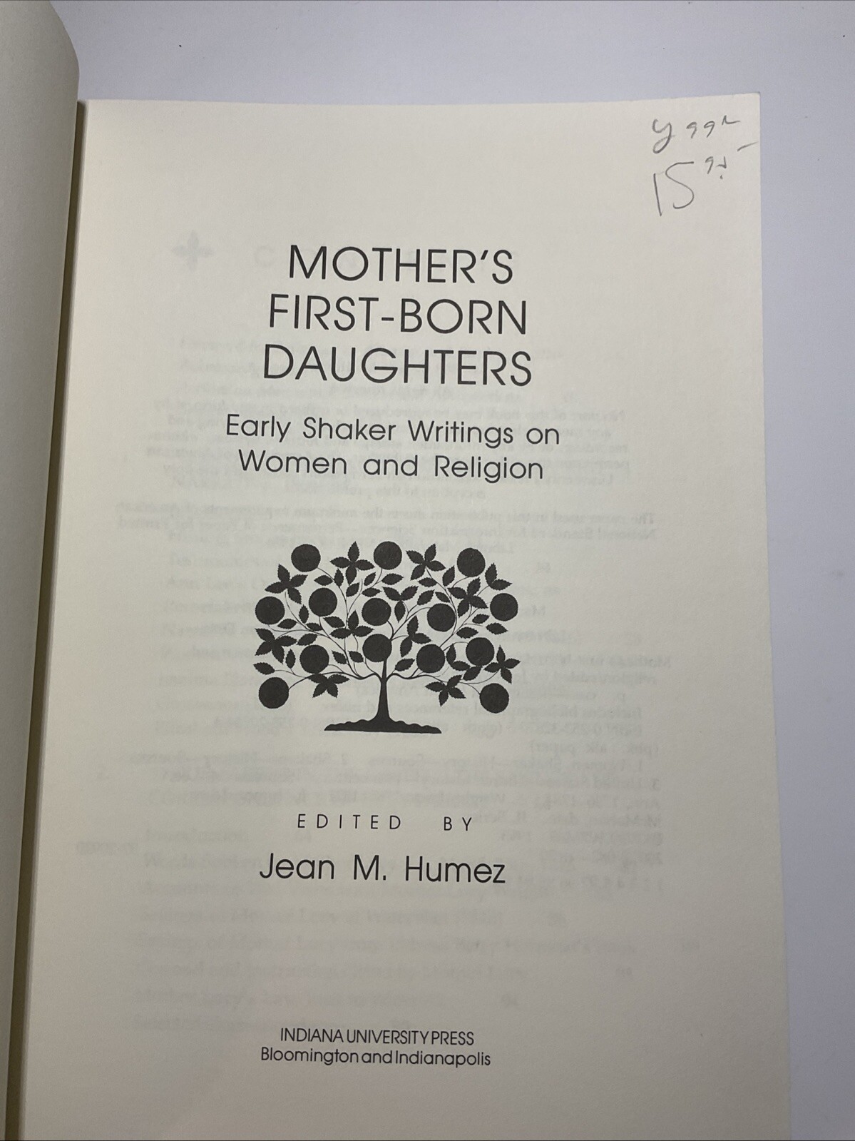 The product is a book titled "Mother's First-Born Daughters: Early Shaker Writings on Women and Religion" by Jean M. Humez. Published by Indiana University Press in 1993 as part of the "Religion in North America Ser." series. It is a textbook in trade paperback format, with 336 pages exploring topics such as Biography & Autobiography, Religion, History, and Social Science related to Christian Church, Shaker Christianity, and Women's Studies in the United States. Minor wear