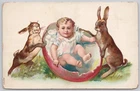 Easter Greetings Divided Back Embossed Postcard Child in Giant Egg Rabbit