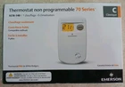 New in box Emerson Non-programmable Thermostat 70 Series 1E78-140 Heat Only, reliable control, Easy Install. Ships quickly to you by the next business day. Designed to work with single-stage heating systems only is the Emerson 1E78-140 thermostat. Use it with 24-volt and millivolt systems. It is not compatible with electric baseboard heat. Easy-to-read digital display with backlight Non-programmable thermostat Compatible with single stage heat only systems Precision control of plus/minus 1F Vertical profile Millivolt compatible Please see the pictures for all the details listed on the box.