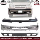 eBay Welcome to APEX AUTO PARTS Store Home About Us Feedback Add To Favorites New Arrivals Ending Soon Contact Us Front Chrome Steel Bumper + Upper Cover and Lower Valance with Fog Light and Tow Hook Holes Textured For 2003-2006 Chevrolet Silverado 1500 and 2002-2006 Avalanche Product Description WARNING : This product can expose you to chemical which is known to the State of California to cause cancer and birth defects or other reproductive harm. For more information go to www.P65Warnings.ca.gov. Specifics and Features : Quantity Sold : Set of 3 Product Fit : Direct Fit Recommended Use : OE Replacement Replaces OE Number : 10397999 19150310 15139805 Replaces Parts link Number : GM1051110 GM1002416 GM1092204 Includes : 1 x Front Bumper Cover Upper Textured Plastic 1 x Front Bumper Face Bar Chrome Steel Without Brackets 1 x Front Lower Valance Air Deflector Textured Gray with Fog Light and Tow Hook Holes Notes : Compatible with : 2003 Chevrolet Avalanche 1500 2003 Chevrolet Avalanche 2500 2003 Chevrolet Silverado 1500 2003 Chevrolet Silverado 2500 2004 Chevrolet Avalanche 1500 2004 Chevrolet Avalanche 2500 2004 Chevrolet Silverado 1500 2005 Chevrolet Avalanche 1500 2005 Chevrolet Avalanche 2500 2005 Chevrolet Silverado 1500 2006 Chevrolet Avalanche 1500 2006 Chevrolet Avalanche 2500 2006 Chevrolet Silverado 1500 2007 Chevrolet Silverado 1500 Classic Shipping Payment Returns Terms & Conditions Feedback Contact Us DOMESTIC LOWER 48 US STATES: FREE SALES TAX: CA ONLY VERY IMPORTANT: Double check shipping address. We are not responsible for incorrect or undeliverable addresses. Please use Shipping & Payments tab on top of page for shipping details for your location. Shipping to PR, HI, AK and PO Box addresses will be charged the same as shipping to Canada. GU, VI, SAIPAN will be charged the same as international shipping rate. For Canada shipping please select the lowest price. We do not offer expedited shipping. US Territories such as GU, VI, SAIPAN will be charged the same as CANADA shipping rate. Transaction will be held until a full shipping amount received. Some of the packages cannot be delivered to a PO Box. Customer is responsible to ensure PO Box address given is deliverable by the shipping company. Package will be held until a valid physical address is provided. Customer assumes shipping charges incurred in shipping to undeliverable address. International buyers are responsible for all customs duties, taxes, and other applicable fees incurred by the country's customs/border regulations. Please contact customs for more information. We ship 98% of all orders the same or next business day after payment received/cleared. Please understand that once orders are shipped, we cannot control the transit times thereafter. Most orders will ship via USPS First Class/Priority Mail or FedEx/UPS or the best suitable carrier for the specific size of the product. We are not responsible for any changes to address after item has been shipped. Item will be shipped out within 24-48 hours after payment cleared, except for weekends and holidays. PayPal e-check takes 3-7 business days to be processed. We will not ship until an e-check has been cleared. We do not accept returns. However, if there is an issue with your package, please contact us within 5 days of delivery. If we are not contacted within this period, we will be unable to process any claims. For emissions related items, please check with your local jurisdiction for emission specific requirements before purchasing. All items do not come with installation instruction unless otherwise specified. If item is questionable, please consult your local professional/mechanic before making purchase. Shipping DOMESTIC LOWER 48 US STATES: FREE SALES TAX: CA ONLY VERY IMPORTANT: Double check shipping address. We are not responsible for incorrect or undeliverable addresses. Please use Shipping & Payments tab on top of page for shipping details for your location. Shipping to PR, HI, AK and PO Box addresses will be charged the same as shipping to Canada. GU, VI, SAIPAN will be charged the same as international shipping rate. For Canada shipping please select the lowest price. We do not offer expedited shipping. US Territories such as GU, VI, SAIPAN will be charged the same as CANADA shipping rate. Transaction will be held until a full shipping amount received. Some of the packages cannot be delivered to a PO Box. Customer is responsible to ensure PO Box address given is deliverable by the shipping company. Package will be held until a valid physical address is provided. Customer assumes shipping charges incurred in shipping to undeliverable address. International buyers are responsible for all customs duties, taxes, and other applicable fees incurred by the country's customs/border regulations. Please contact customs for more information. We ship 98% of all orders the same or next business day after payment received/cleared. Please understand that once orders are shipped, we cannot control the transit times thereafter. Most orders will ship via USPS First Class/Priority Mail or FedEx/UPS or the best suitable carrier for the specific size of the product. We are not responsible for any changes to address after item has been shipped. Payment Item will be shipped out within 24 hours after payment cleared, except for weekends and holidays. PayPal e-check takes 3-7 business days to be processed. We will not ship until an e-check has been cleared. Returns 30 Days money back, please notify us within 30 days after you've received your purchased item. All return requests must be submitted through your eBay account. You have to obtain a RMA (Return Merchandise Authorization) number from us, and have the RMA number written on the return package. Buyers pay for return shipping fee. Items to be returned must be in resalable condition. All returns are for refund ONLY. No exchange accepted. Returns for refund are subject to a 20% restocking fee. Terms & Conditions For emissions 
