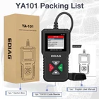 Automotive OBD2 Scanner Car Check Engine Fault Code Reader OBDII Diagnostic Tool EDIAG YA-101 Automotive OBD2 OBDII Scanner Check Engine Light Diagnostic Tool PK CR319、AL319、AD310 What live data can be read by ediag YA-101 car code reader? How much data can be read depends on the vehicle, there are over 40 live data PIDs , including FUELSYS(fuel system status), LOAD_PCT(Calculated load value), ECT(Engine Coolant Temperature), SHRTFT(Short term fuel trim-bank), LONGFT(Long term fuel trim-bank), Engine RPM , VSS(Vehicle Speed Sensor), SPARKADV( Ignition timing advance for cylinder 1 ), IAT(Intake air temperature), MAF(Mass Air Flow), TP(Absolute Throttle Position), EQ_RATB1S1(Equivalence Ratio Bank 1, Sensor1), O2B1S1(Oxygen sensor output voltage), EVAP_PCT(Commanded Evaporative Purge), etc. Why the YA-101 Car Code Reader deserve to own? -Enhanced OBDII Diagnostic Functions: Read & Clear DTCs, I/M Readiness Status, Read Freeze Frame and Data stream, Read Vehicle Information, O2 Sensor Test , On board Monitored systems Test (mode 6) , EVAP Test (mode 8) , Turns off Malfunction Indicator Light. - Color display Screen and high physical button design. -Support battery detection: Let you better to know your car's battery statues. -Lifetime Free Update, no need to install drivers can be updated via USB, so you always have the latest car model data. -Support 9 Languages: English , French , Russian , Spanish ,German, Italian ,Portuguese, Japanese, Chinese. - Support all vehicles from 1996 &newer (OBDII &CAN). -Wide Target Audiences : YA-101 is a useful car code reader for entry-level pro and savvy DIYer,home and autoshop Mechanics,etc. EDIAG YA-101 provides full OBDII/EOBD diagnostic functions and meets protocols such as ISO9141-2, ISO14230-4, SAEJ1850, and ISO15765-4. EDIAG YA-101 is better than LAUNCH Creader3001 and CR319.YA101 provides a permanent free upgrade service that can be quickly upgraded and free of drivers. YA101's mode 6 function is precise and perfect, not only can check the fault code, but also can find the cause caused by the fault code, and can carry out battery test .YA101 is your best choice. EDIAG YA101 FUNCTIONS: Engine Check Including Read code Remove code Live data Freeze frame I/M readness Freeze prame O2 sensor test On-Board Monitor EVAP system Vehicle Information reading Advanced Features: Check Engine Light Faster and in-depth scan the engine modules, it helps to find out the hiddened issue of the engine light.Focus on the important modes like read and clear codes, mode6 and mode8 , you can easily to know the on-board monitor system and the EVAP system .You can also see the status of the misfire cylinder. FULL 10 OBDII Modes 1.Reading Codes: Show the detailed description of the Diagnostic Trouble Code (DTCs) 2.Erasing Codes & Reset: Turns off Check Engine Light (MIL), clears codes and resets monitors. 3.Data Stream : Reads and displays live ECU/PCM data stream, plotting functions graphically and stores freeze frame data. 4.I/M Readiness Status : Shows whether the various emissions-related systems on the vehicle are operating properly and are ready for inspection and maintenance testing. 5.Read Live Data Stream: Show the information of continuous data stream from a vehicle in live graphic (waveform) display. 6.View Freeze Frame Data: Check the certain vehicle conditions which are recorded by the on-board computer at the time the emission-related fault occurs. 7.O2 Sensor Test: Allows retrieval and viewing of O2 sensor monitor test results for the most recently performed tests from the vehicle's on-board computer. 8.On-Board Monitor Test: Retrieves and displays test results for emission-related powertrain components and systems. 9.Read Vehicle Information : Display the information such as VIN (Vehicle Identification Number), CID (Calibration ID) and CVN (Calibration verification number), etc. 10.Component Test: Certain vehicle components can be actuated by commands sent from the scanner to test their operability. Lifetime Free Update No need to install drivers. Download the application of the YA101 on PC and copy it to the YA101 via the USB cable. Review Back functions Help you record and play back a readout or graph. This is useful if you have an intermittent problem that doesn't generate a code. Quick Operations and Diagnosis YA-101 OBDII scanner has a fast and intuitive operation through an easy-to-use and quick diagnostic response than comparable products. Support Car Models for OBDII diagnostic function: ( Note: YA-101 only Support 12V cars, Does not support 24V Truck ) YA-101 Support all legislated OBD2 protocols car : 1.SAE J1850 PWM(41.6Kbaud) 2.SAE J1850 VPW(10.4Kbaud) 3.ISO9141-2(5 baud init,10.4Kbaud) 4.ISO14230-4 KWP(5 baud init,10.4 Kbaud) 5.ISO14230-4 KWP(fast init,10.4 Kbaud) 6.ISO15765-4 CAN(11bit ID,500 Kbaud) 7.ISO15765-4 CAN(29bit ID,500 Kbaud) 8.ISO15765-4 CAN(11bit ID,250 Kbaud) 9.ISO15765-4 CAN(29bit ID,250 Kbaud) American Car : F or Chrysler , for Ford, for GM, For Jeep ... Need Standard OBD2 Protocols from 1996 to now European Car : For Alfa romeo , for SAAB ,for Acura , for Opel , for Audi for Seat , for Peugeot , for Renault , For Bentley , for Skoda , for Daewoo , for Benz , for Daihatsu , for Land Rover , for BMW , for Vauxhall , for Citroen , for Volvo , for Fiat , for VW , for Ford , for Jaguar... Need Standard OBD2 Protocols from 2000 to now Japanese/Korean Car: F or KIA, for Isuzu, for Honda , for Mitsubishi, for Hyundai , for Dacia , for Lexus , for Mazda, for Nissan, for Subaru , for Suzuki, for Toyota... Need Standard OBD2 Protocols from 2006 to now Chinese Car: Need Standard OBD2 Protocols from 2008 to n ow NOTE: Even though it is compatible with most cars, but different regions support the vehicle OBD2 protocol at different times, or some car is spercial designed, so it may not be compatible with some cars which do not support OBD2 protocol. Specifications: Screen: 1.8" TFT Screen Voltage: 12V Operating Temperature: 0℃~ 50℃(32