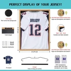 Jersey Frame Display Case Specifications Color: Oak finish Outer Dimensions: 31.25" x 23.25" x 1.5" Inner Dimensions: 30.5" x 22.5" x 1” Weight: 10.6LBS Material: Wood frame, Acrylic view glass, pin board panel Accessories: Wood hanger, Iron hanger, instruction manual, silvery thimble and pins, assembly hardware. furniture grade Jersey Display case has a classical design and construction. It is very detailed and attractive, and also very affordable. Perfect for displaying any type of sports jerseys. Baseball, Basketball, Football, Soccer and Hockey etc. Jersey Frame is durable enough for a long-lasting working life. Shatter proof 92% transparency and 98% UV protection acrylic glass panel, velvet like felt lining along with two gold plated anti-theft locks can well protect your cherished sports memorabilia or collectibles. A must have if you have autographed memorabilia going inside. This will give your case a little extra security and keep unwanted dust from your prized items. Jersey frame display case has a acid free black felt lining inside. Giving you great contrast to your item. The background on the case is pinnable, allowing you to pin your item down if you choose to. It can also be used as a shadow box to display military uniform, graduation memorabilia and other cherish memories.Or attach other misc items, like pennants, photos and ticket stubs etc. Display case is setup to attach either vertically or horizontally, giving you the flexibility you need to display your items either direction. · RELIABLE QUALITY AND FUNCTION - Jersey frame Display Case can work long enough as you wanted which is completed with wood and anti-fading mat Oak. Shockproof 92% transparency and 98% UV protection acrylic glass panels,velvety felt lining inside and two gold-plated burglar proof locks are protecting your precious sports souvenirs and jersey collectibles. · THREE DISPLAYING OPTIONS - The iron Hanger and wood Hanger and Pin Board allow you to display your jersey in 3 different ways. The wood hanger works better for sleeveless jersey like basketball shirt. While the pin board display a tight wrinkle free for long-sleeved jersey such as football, hockey 2xl jersey. The iron Hanger for long-sleeved jersey is for the people who do not want to do the pin board. jersey shadow box comes assembled, set up easily in minutes! · ONE SIZE FITS ALL - Make a great gift for sports fans! This large size display frame of 31.25" x 23.25" x 1.5" fits most sports jerseys of baseball, basketball, Football, Soccer, and Hockey etc. It can also be used as a shadow box to display military uniform, graduation memorabilia and other cherish memories. · PROTECT CHERISHED SPORTS JERSEY - The acrylic panels of jersey display case is made of high grade acrylic, which won't turn yellow over time and always offer ultra clear viewing (92% transparency). THE 98% UV protection ensures no fading of your jersey exposed to natural light. The gold plated anti-theft locks on the frame add extra safety. · STRUDY PACKAGING - Considering the fragility of the product, jersey display frame is surrounded by foam to get a full protection.Thick protective stickering on acrylic glass panels ensures scratch free transit to your home.he package includes: Jersey Display Frame(x1); Hanger(x2); Pin Board(x1); Hanging Hardware; Silver Thimble and pins; visual user manual(x1).