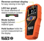 Klein Tools ET140 Pinless Moisture Meter - Detects 3/4"" Below Surface WATER LEAK DETECTOR detects relative moisture content from leaks and flooding PINLESS MOISTURE METER measures relative moisture content in building materials NONDESRUCTIVE DETECTION up to 3/4-Inch deep using Electromagnetic field (EMF) technology USE ON DRYWALL, MASONRY, HARDWOOD, AND SOFTWOOD; calibrated for these materials only REVERSE-CONTRAST DISPLAY for easy viewing of reading and nine LED bars to indicate moisture range FULL FEATURE TOOL includes hold, low battery, and auto-power off functions COMPLETE MOISTURE METER KIT includes meter with 2m drop protection, 9V battery, and instruction manual When you receive your order and have any queries or concerns about the product, feel free to message us. We guarantee 100% resolution for you. Our commitment is to provide high-quality products and exceptional customer service, ensuring your trust and satisfaction.