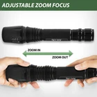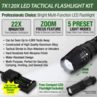 Professional LED Tactical Flashlight with Holster Constructed of aircraft grade aluminum alloy, the TK120X LED tactical flashlight with holster gives you the durability needed for outdoor activities like camping and hunting. But it’s also used by many security pros due to its Strobe Light function. This LED tactical flashlight is the perfect addition to any household, but it’s often used by hunters and security professionals. It’s a tool that all serious hunters, campers, professionals and security people should have in their arsenal. This unique LED Tactical Flashlight has multiple light modes for use with the zoom feature. This gives you a truly adjustable focus that can be invaluable during emergencies like floods, earthquakes, hurricanes and tornadoes. Since the flashlight is made of an aircraft grade aluminum alloy, it has a hardened anodized finish that will withstand moisture, hard bangs and other heavy usage. This professional LED flashlight is a great choice for those working in the disaster industry. How the Adjustable Focus Zoom Works One of the important features of this LED flashlight is the zoom lens. The Adjustable Focus Zoom on the TK120X LED Tactical Flashlight allows you to shine the light beam on a targeted area. It can even be something in the distance. Security guards often need to see exactly what something is even in a dark warehouse. It might be a stray animal but it could be a thief. 5 Light Modes The TK120X Flashlight offers five different preset light modes (High, Medium, Low, Strobe and SOS). Want to change to a different light mode? It’s easy. Just quickly click on the tail-cap button. This is a must-have for those who like to go jogging in the evenings. This professional LED flashlight can be a lifesaver for individual self-defense. Of course, if you just need a simple flashlight on any project, use the medium or low beams. In S.O.S. mode, the flashlight will send out the international Morse code distress signal. When activated, the light beam flashes quickly three times, slowly three times, followed by three more fast flashes. The light flashing frequency is standard and the S.O.S light mode repeats itself when the light cycle completes. Details and Specifications 100,000 Hour LED: Bright light intensity; long-lasting with no bulb to burnout Durable: Constructed of aircraft grade aluminum alloy with a hardened anodized finish for ruggedness Design Features: Water resistant, anti-abrasive, shock-proof Zoom Focus: x1 x250 x500 x1000 x2000 5 Light Modes: High, Medium, Low, Strobe and SOS Attached Hand Lanyard: Removable lanyard clip Power Options: Powered by 2 x 18650 lithium-ion batteries (included) Extended Run-Time: About 2 hours of additional run-time as compared to the TK120 Flashlight Brightness: Up to 900 lumens on the high setting. Using the zoom feature, this increases up to 1600L Color: Black FREE Flashlight Holster with Purchase Package Includes: 1 x TK120X LED Tactical Flashlight with Holster 1 x Attached Lanyard (removable) 1 x Attached Belt Clip (removable) 1 x Rapid Battery Charger 2 x Rechargeable Batteries 1 x Storage Case for Batteries 1 x Mini E300 LED Flashlight (battery not included) 1 x User Manual The TK120X Tactical Flashlight with holster is a great choice for hunters, disaster workers, security guards or anyone who needs to see better at night. It’s rugged, durable and ready to go anytime. [chained_products]