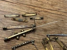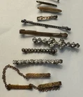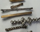 Lot of ten ladies lingerie or bar pins from the Edwardian & Art Deco eras. Eight have open or safety pin style clasps with the exception of the sterling silver bar pin which has a roll over clasp. There are three pins with clear rhinestones, and the rest have scrolled designs-flowers, lines or similar designs. The clasp on the sterling & rhinestone bar pin needs repaired. There is a three pin set, attached by gold filled chain. This is a nice collection for someone collecting jewelry of this age. Email with questions.