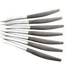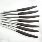 Offering a set of 7 Interpur INR2 dinner knives 8 7/8” long, mid-century modern style, a discontinued pattern made in Japan. The brown synthetic handles are sturdy and have cracks, as shown in the close-up photos. The stainless steel is in good condition, no chips, dents, or disposal damage. There are surface scratches, some pitting, and wear consistent with normal use. Please view the photos for details and condition. Measurements and photo colors are approximate. For extra protection your items will be packed in plastic sleeves and shipped in a box. Shipping is your choice of USPS Ground Advantage or USPS Flat Rate Priority at the rate determined by eBay. Follow your item's delivery progress with the USPS website Tracking Tool. Terms of Sale: Photos are of the actual item you will receive and sold "as is". Placing an order is your agreement that you know what you are buying, have viewed the photos and find the condition acceptable. Use eBay Messages to contact me for questions or concerns about your order. Please inspect your items upon arrival and contact me if there are any problems. Free returns within 30 days after delivery.