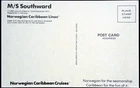 10006. CATEGORY : Transportation TYPE : Color Postcard (Standard; Chrome) DESCRIPTION : Back: “M/S Southward, 17,000 tons of pleasure. Commissioned 1971. Registered in Norway. Norwegian Caribbean Lines. Sleek and new and going to just about anyplace you’d ever care to visit in the Caribbean.” CONDITION : Unused; never mailed . … Minor corner and edge wear. Light soiling and age tanning. Very Good condition… Sold AS IS. Look carefully at the pictures to Judge Condition for Yourself. Please pay for your order after Combining ALL ITEMS on one invoice! This saves both of us money! You save on S/H charges and I save on fees! Thank you kindly, Judy & George …. If you plan to purchase multiple items, just put all the items you want into your Ebay cart, then press “REQUEST TOTAL” and I will be able to invoice you with combined shipping. Make sure you’re purchasing via computer, as this option is not available when buying with your phone. Once you have purchased an item and we have wrapped it for shipping, additional items CANNOT be added, and must be shipped separately. I offer and accept other payment options, besides PayPal, for those who do not have such an account. All books are protected by a moisture seal, bubble wrap, and they are packaged in a cardboard carton for added protection. All postcards, vintage paper items and historical memorabilia are packaged with stiff cardboard and marked “Do Not Bend”.