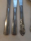 Mixed Lot of 10 Stainless Flatware Forks/Knifes/Spoons Patterns Replacements In good pre-owned condition may show signs of wear from use/handling/storage/display. Please view all pics for condition/details/flaws/issues. SOLD AS IS Lot of flatware unknown makers 6 dinner knifes 1 butter knife 1 dinner spoon 2 forks There is/maybe marks/spots/dirt/debris/rust/tarnish please see photos 1-20, there is/maybe paint loss/sticker loss please see photos 1-20, there is lite discoloration please see photos 1-20, there are surface scratches to item please see photos 1-20, please see all photos for condition/issues/details.