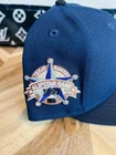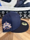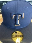 This is a rare New Era baseball cap collaboration with Prociety and Rushmore, featuring a Texas Rangers Noho Nati design in a size 7 3/8. The cap is solid blue with black accents, made of polyester material. It is part of the 20th Anniversary Capsule collection, showcasing various logos and themes including MLB, classic sports, and city vibes. Perfect for casual wear in the summer, fall, or spring seasons.