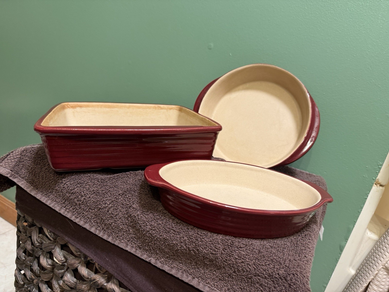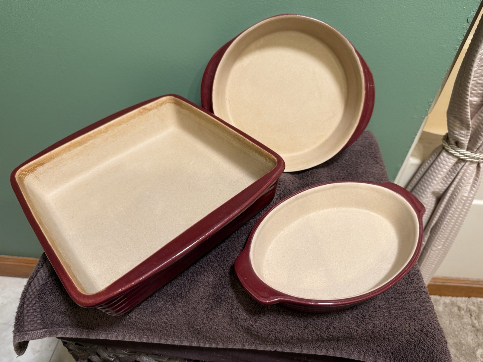 The PAMPERED CHEF Family Heritage Stoneware OVAL BAKER 8.5” is a three-piece set that includes an oval baker, lasagna pan, and pie pan. Made in the United States, the stoneware bakeware is glazed ceramic, suitable for use in both electric and gas ovens. The red stoneware material adds a touch of elegance to your kitchen, and its durable construction ensures long-lasting performance for all your baking needs. The pie and oval dish appear to be new, 9-inch lasagna pan slightly used.