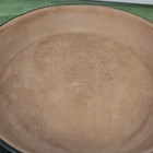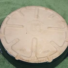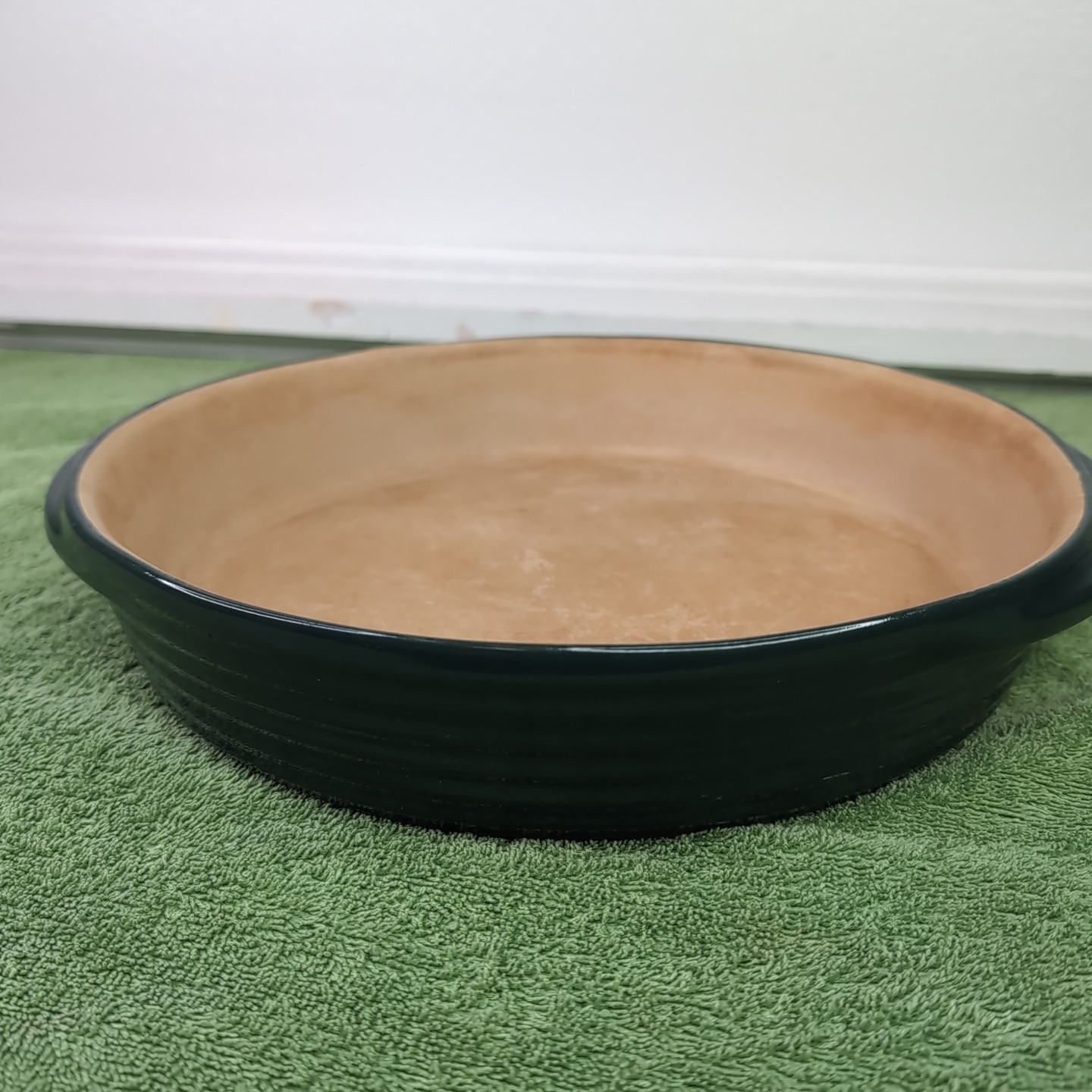 Pampered chef 11 inch pie pan. Green glaze. This is used and well seasoned. Does have some dark marks on the bottom. Please see the pictures.