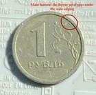 Rare 1 ruble 1997 Moscow mint, Variety "Wide Rim". Coin in very good condition. From circulation. Production error. In the last photo: a "rare" coin on top, a "simple" one below. 1 рубль 1997 Московский монетный двор, "широкий кант". Ошибка штампа при производстве. Редкая монета. Из оборота.