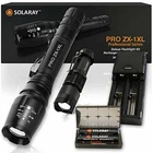 Professional LED Tactical Flashlight Kit with Free Holster Bright LED Tactical Flashlight with Adjustable Zoom Focus and 5 Light Modes Key Features Ultra-Bright lumen Cree super-silicon carbide, single-die, XML LED chip. Strong enough to light up an entire room or zoom in on far objects with zoom in lens. Durable water resistant aircraft grade aluminum body with quality lens and premium tail switch made for years of use. Compact and Convenient weight-to-size ratio for anywhere use, providing more than enough lighting needs. Multiple Selection Modes from Tactical intruder strobe to SOS emergency mode to High, Medium, or low beam selection modes. Built Tough, a must have for survival situations, storms, roadside emergencies or outdoor activities. Dimensions: 8" (Length) x 1.5" (Width) The ZX-1XL Professional Series flashlight kit is perfect for use during power outages, vehicle emergencies, fishing, walking the dog or anytime you find yourself out in the dark. Join the exclusive ranks of many professionals that have discovered the power of Solaray Tactical Flashlights. Solaray’s exclusive memory light mode circuit adds to the many features of the ZX-1XL. It also features a versatile, easily adjustable zoom focus lens for close up and long-distance lighting. Operates with a long lasting Solaray rechargeable 18650 lithium-ion This super powerful flashlight, uses an ultra-bright genuine U.S. made CREE XML-T6 powered LED, offering high performance and quality at a low cost. The ZX-1XL is water resistant, rugged, and built to last. It’s a light you can count on when you need it Perfect multipurpose light, Great for home security, self-defense and tactical applications, search and rescue, law enforcement and natural disasters or simply take it camping, hiking or hunting; wherever you need a reliable flashlight Constructed from rugged aircraft grade aluminum with an attached heavy-duty metal belt clip and deluxe lanyard. Professional grade yet lightweight and durable makes this an essential piece of equipment for travel, outdoor sports and bug out bags. Solaray is proud to be used by police and fire departments nationwide as well as FBI, Homeland Security, Coast Guard, and working professionals everywhere. Click “Add to Cart” now and see why so many choose Solaray to light their way! Package Includes: 1 x ZX-1XL Tactical Flashlight 1 x Mini LED Flashlight 2 x Rechargeable 18650 Lithium-ion Batteries 1 x Smart Battery Charger 1 x Battery Storage Case