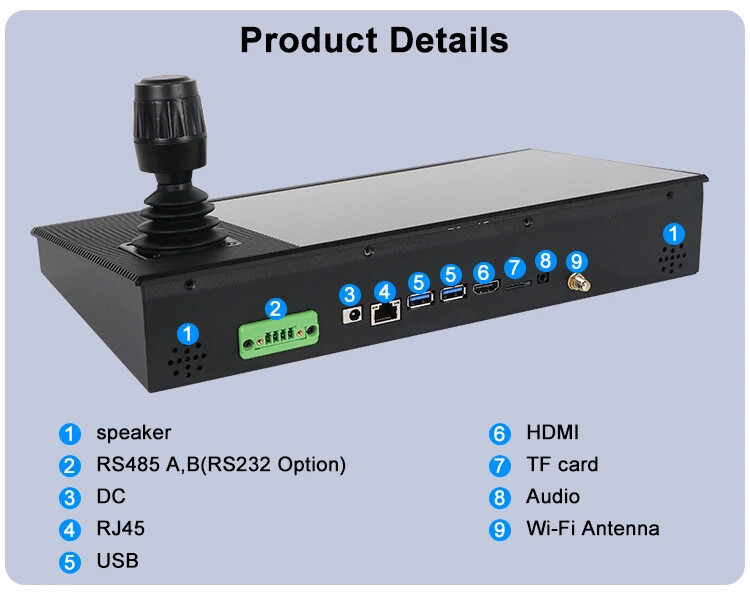 Product Description Product Features: Main Features: – Cross protocol mix control with IP/ RS 485/(RS 232 option) – Control protocol by VISCA, VISCA Over IP, Onvif and Pelco P&D & ONVIF – Control up to 255 IP cameras on one single network – T professional zoom controlling via software – Auto search available IP cameras in one network and assign IP addresses easily – the camera be currently controlled via our professional PTZ software – Aluminum alloy housing with 10. 1inch LCD display, Hall Joystick rotation button – PoE and 12V DC power supplies Product Speification: