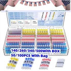 Solder Stick Waterproof Seal Sleeve Heat Shrink Butt Wire Connectors Feature: When properly heated and shrunk, they provide a seal that is resistant to water, steam, salt and other contaminants. Heat shrink insulated connectors will provide improved pullout strength and strain relief. The translucent heat shrink material allows visual inspection of the connection, and included almost frequently-used connectors' size. Excellent splice for marine, automotive, outdoor, or harsh environment use. Specification: Insulation Sleeves: PE Terminal Body: Tin Ring Colors : Red, Blue, White, Yellow, Green Type and Size: White Heat Shrink Connectors: Suits cable/ wire sizes AWG 26-24 / 0.25-0.34mm2 Red Heat Shrink Connectors: Suits cable / wire sizes 18-22AWG / 0.5-1.0mm2 Blue Heat Shrink Connectors: Suits cable / wire sizes 16-14AWG / 1.0-2.5mm2 Yellow Heat Shrink Connectors: Suits cable / wire sizes 12-10AWG / 4.0-6.0mm2 Green Heat Shrink Connectors : Suits cable / wire sizes 18-16AWG/ 0.75-1.25mm² Package Included: (The items you select) 50/100/140/260/340/500pcs Heat Shrink Butt Connectors