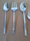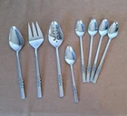 International Deluxe Stainless Serving Ware Silverware Serving spoon 9 inch, slotted serving spoon 9 inch, serving fork 9 inch, 4 parfait spoons 7.5 inch, 1 spoon 6.5 inch. Scroll design, see pics.