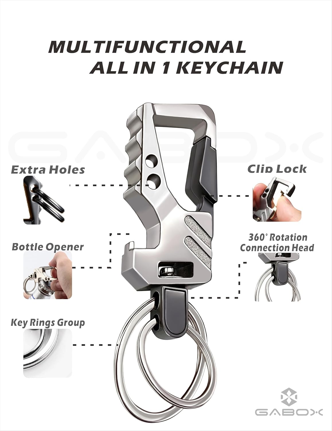 Product Description Classic Design Meets Business Occasions The unique design of heavy duty carabiner fit for men, women, friends and parents . Large hook for quick and easy access on any loops, jeans and backpack Bottle Opener Keychain for Beer & Coke Designed carabiner with versatility make the keychains can be used to quickly open the bottle cap if you want to drinking beer anywhere and anytime Premium Car Keys Keychains The color of the metal is perfectly coordinated with the car key . With complete functions GABOX keychains make all your keys organized and pockets free from clusters