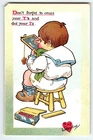 This vintage Valentine's Day postcard features a charming image of a seated boy in a sailor suit from Raphael Tuck & Sons' Nursery Don'ts series. The lithograph print is on standard size paper and has a divided back. The postcard is unposted and in its original condition, perfect for collectors of pre-war art and holiday memorabilia. The postcard is a single unit and comes from a set of 12. It was manufactured in Germany in 1908 and is an original print. The postcard is not signed and cannot be personalized. It would make a lovely addition to any collection of art, fantasy, or children's memorabilia. Unposted. Antique original vintage post card. Has torn off left corner, corner dings and age wear. Stock #val104. Additional postcards are in our store. Use cart to bundle and save. All post cards are old originals and may or may not have writing on back. Thanks for looking. Please check back soon for more great items.