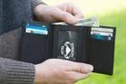 Enjoy style and safety together with 's men's leather trifold wallet. This men's leather trifold wallet features quality napa leather, 9 card slots and an ID window, divided billfold, and our secure RFID blocking lining to keep your personal and financial info safe. Measuring 3.25" x 4.25" when closed and 9.25" x 4.25" when open this large men's wallet has 9 card slots that can comfortably fit 12+ cards. It also includes a divided billfold to keep your money and receipts organized. The RFID blocking lining helps keep your personal and financial info safe by blocking malicious attempts to steal your identity from your chip enable cards. Our lining blocks high frequency (13.56 MHz) RFID signals. Packaged in a handsome box, this stealth wallet makes a great gift for men.
