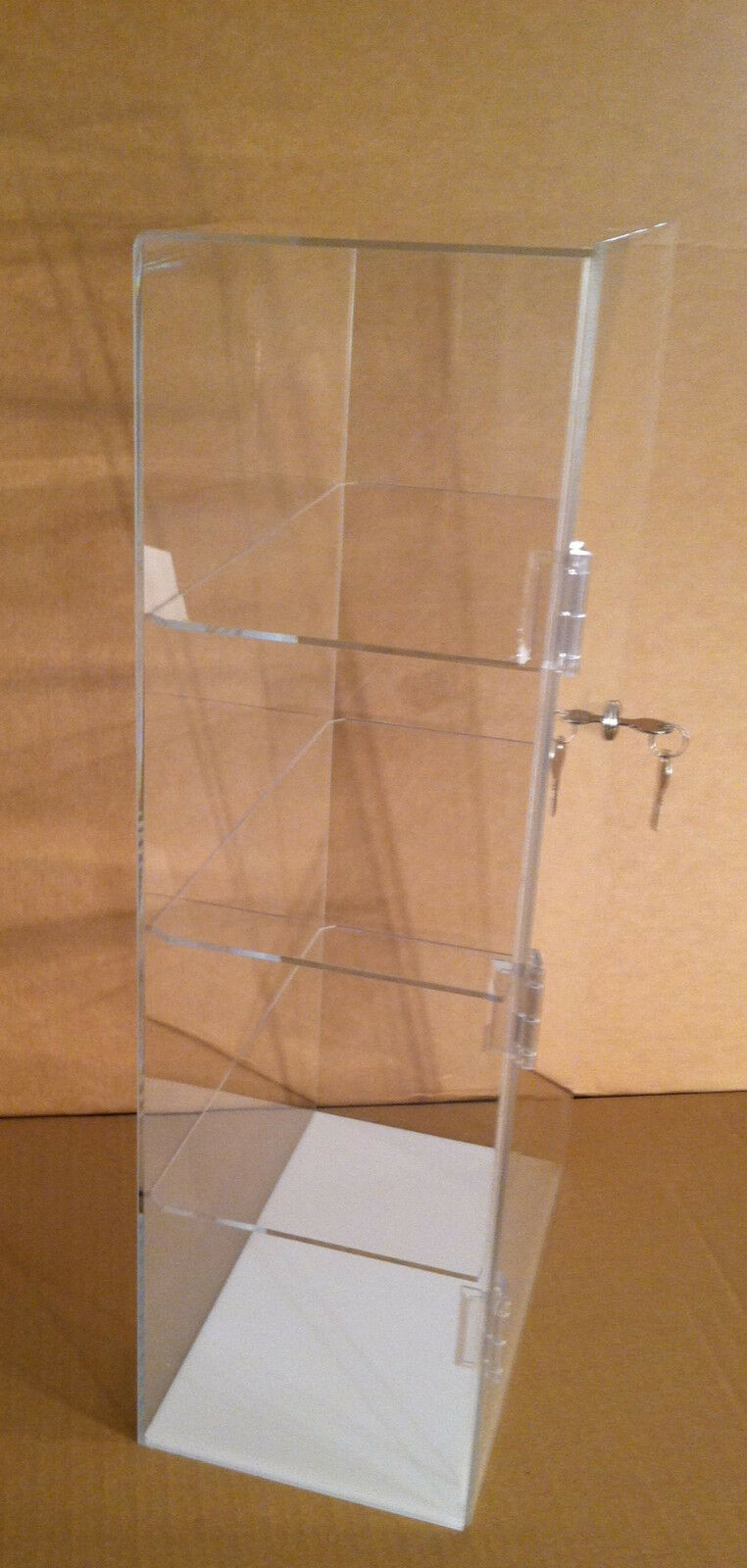Acrylic Countertop SNEAKER Showcase 12.5 x 7 x 22.5 Display case....... WITH LOCKING DOOR Also Great for : Sneakers, Ski Googles, Cupcakes, Cupcake stand, Donuts, Donut Stand, Pastry Display, Bakery Countertop Display CLEAR BASE Available on Request 1) 12.5" wide x 7 " deep x 22.5" tall ......(inside measurements) 2) CUSTOMIZE YOUR DISPLAY......select shelf spacing that works best for you and your product.... if you do not choose.....we will ship you (a) default spacing (a) 5.5", 5.5", 5.5", 5.5" .....as pictures (Default) (b) 8, 7, 7 (c) 6, 6, 5, 5 (d) 11, 11 ...........one shelf in middl e ( e) YOUR CHOICE JUST LET ME KNOW WHICH SHELF SPACING WHEN PAYING FOR DISPLAY 3..ALL SHELVES GLUED IN PLACE 4) 1/8" Clear acrylic body with 1/4" white acrylic base ( no other display on ebay can compare......the 1/4 thicker acrylic base material is what makes our displays sturdy) 5) Ask about other shelf spacings 6) UPS Ground shipment to Lower 48 States ONLY ( no HI, no PR, no AK) 7) Additional display cases .......multiple shipping discount 8) Display is Hand-Made in Katy, Texas. I have been building Acrylic Displays for 30 years. If you want one of my customized displays......professionally crafted.....you are at the right place !! 9)I am building these custom displays one at a time to order. 10) If you are looking for a mass produced display which uses thinner acrylic body and thinner acrylic base......we are not for you !! 11) 100% Guarantee that your custom display will arrive unbroken. We take great pride in wrapping your fragile display in lots of bubble wrap and kraft paper. Jewelry Display, Necklace Display, Watch display, Bracelet Display, Ring Display, Knife Display, Knives Display, Collectible Display, Collectable Display, Coin Display, Antique Display, Video Game Display, Electronic Cigarette Display, E Cig Display, E Cigarette Display, Cigarette Display, Phonecard Display, Cell phone Display, Smart Phone Display, Verizon Display, ATT Display, T Mobile Display, Cricket Display, ipad Display, iPhone Display, Vitamin Display, Supplement Display, Gun Display, Pawn Shop Display, Perfume Display, Nail Polish Display, Countertop Display, Revolving Display, Revolving Showcase, Lockable Display, Acrylic Showcase, Plastic Display, Clear Display, Tiered Display, Pen Display, Sunglass Display, Lotion Display, Tanning Lotion Display, Doll Display, Electronic Display, Ink Display, Cartridge Display, Hard Drive Display, Body Jewelry Display, CD Display, DVD Display, Jerky Display, Candle Display, Mary Kay Display, Cosmetic Display, Makeup Display, Lipstick Display, Lexan Display, Display Case, Showcase, Plastic Box