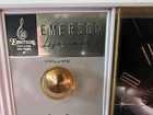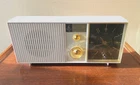 VINTAGE EMERSON LIFETIMER I TUBE AM CLOCK RADIO Very cool vintage Tube radio AM Alarm Clock with Civil Defense Band *Shows the Triangle on the tuning dial! * *Sold As IS AS Found! * Will need a power cord* Made in Jersey City, N.J. USA 1962 Technical Specifications Number of Tubes 5 Valves / Tubes 12BE6 12BA6 12AV6 50C5 35W4 Main principle Superheterodyne (common); ZF/IF 455 kHz; 2 AF stage(s) Tuned circuits 6 AM circuit(s) Wave bands Broadcast only (MW). Power type and voltage Alternating Current supply (AC) / 105 - 125 Volt Loudspeaker Permanent Magnet Dynamic (PDyn) Loudspeaker (moving coil) from Radiomuseum.org Model: G-1704B Lifetimer I Ch= 120580 - Emerson Radio & Phonograph Shape Tablemodel with Clock ((Alarm-) Clock Radio). Notes The Emerson Model G-1704B is an AC Operated 5 Tube AM Receiver with Electric Clock. Keywords: vintage am radio, historical radio, classic 1960's radio, audio tube radio, civil defense radio, retro style radio, vintage electronics