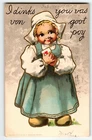 This vintage postcard features a charming image of a Dutch girl wearing wooden shoes, with a Valentine's Day theme. The lithograph was originally published by H.I. Robbins in 1907 in the United States. The postcard is a standard size of 5.5 x 3.5 inches and has a divided back, with a postmark indicating that it has been posted. The postcard is perfect for collectors of vintage postcards or those who appreciate art, holiday, people, greetings, and children themes. The postcard is made of paper and is an original print from the pre-war era. Posted with 1908 cancel. Antique original vintage post card. Has writing on front, soiling, corner dings, and age wear. Stock #val122. Additional postcards are in our store. Use cart to bundle and save. All post cards are old originals and may or may not have writing on back.