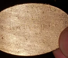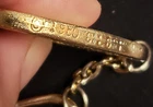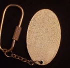 This vintage 1980 key chain features a gold color oil rig design with a detachable keyring and engraving. It is made of stainless steel and is part of the oil industry character family.