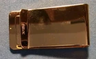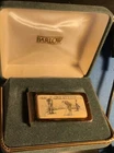 This Vintage Barlow Gold-tone Money Clip features a faux scrimshaw design with golfers on green with caddy on a green. The slim fold clip is made of gold tone metal and measures 2" in length and 1" in width. It comes in a box case and carries a vintage aesthetic, perfect for golf enthusiasts. The money clip is accented with a logo and is a unique accessory for men who appreciate nature and golf themes. Made in the United States, this item is a stylish and functional addition to any man's accessories collection. See scans to help see the condition. Never used.