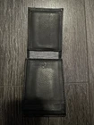 This vintage black wallet from Levi's is the perfect accessory for any stylish man. Made from high-quality leather, it features a solid pattern and a slim fold design for a sleek and compact look. The wallet is accented with the iconic Levi's logo and has a magnetic folding feature for easy access to your essentials. With enough space for your cash, credit cards, and ID, this wallet is both practical and fashionable. It's perfect for any occasion, whether you're running errands or going out for a night on the town. So why wait? Add this vintage Levi's wallet to your collection today!