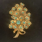 VTG Metal Floral Bouquet Ribbon Tied Brooch Aqua Rhinestones Shows Some Age & Wear. SEE ALL PICTURES
