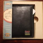 Vintage mens fossil leather trifold wallet (New - original box 1954 ) This is a vintage men's Fossil leather trifold wallet in black. The wallet features a classic design with a focus on holding money and credit cards. It is made of high-quality leather and exudes a timeless style. The brand is Fossil, known for its durable and stylish accessories.